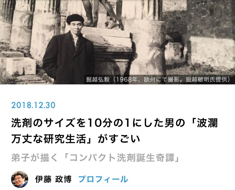 2018年12月30日、講談社ブルーバックスWebに恩師の掘越弘毅先生のことを書いた『洗剤のサイズを10分の1にした男の「波乱万丈な研究生活」がすごい』が掲載されました。