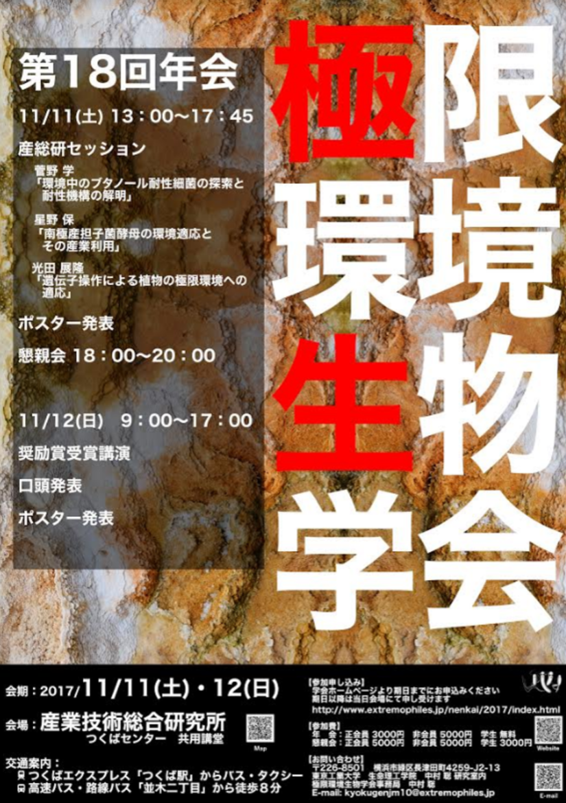 2017年11月11日(土)~12日(日)につくば・産業技術総合研究所つくばセンター・共用講堂で開催さ入れた第18回極限環境生物学会・年会に参加しました。M2長縄君、M1金田さん、M1薄井君がポスター発表を行いました。