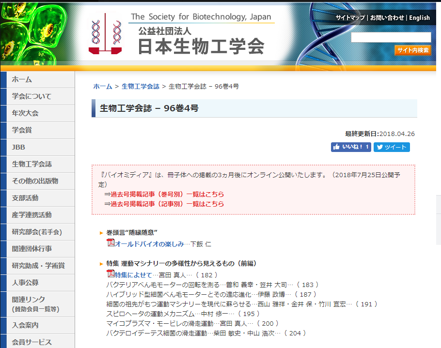 2018年4月26日 に生物工学会誌から宮田領域の6テーマを集めた特集「運動マシナリーの多様性から見えるもの(前編)」が出版されました.