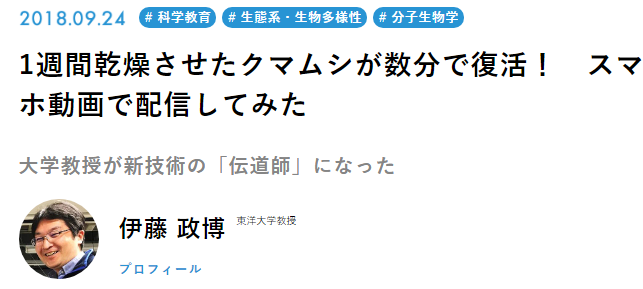 2018年9月24日、講談社ブルーバックスWebにスマホ顕微鏡、3Dプリンタ、クマムシのコラボによるアウトリーチについての記事が掲載されました。