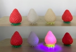 大阪市大宮田研の浜口さんに紹介してもらった蛍光塗料入りの樹脂で光るイチゴ(右から2番目)を3Dプリンターで制作してみました。葉の部分は、緑の蛍光樹脂、実の部分は赤い蛍光樹脂で作っています。ブラックライトの照射の有無できれいに違いが出ています。両端は普通の色付き樹脂で、左から2番目は蛍光色素が入っていない樹脂で作ったものです。