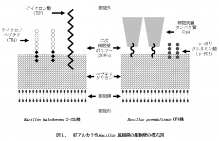 好アルカリ性バチルス属細菌のペプチドグリカン構造は,一般的なバチルス属細菌(例えば納豆菌(バチルス・ナットー))のものと同じ構造をしています。好アルカリ性バチルス属細菌の細胞壁の特徴は,高アルカリ性環境に適応するための二次的な細胞壁ポリマー(SCWPs)を持つことです。
