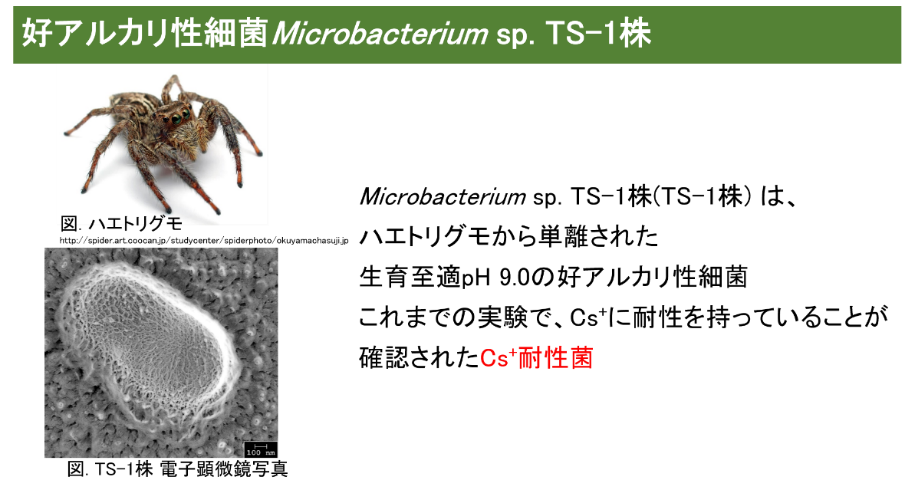 私たちの研究室では、 2013 年にハエトリグモを擦潰したサンプルから好アルカリ性細菌 Microbacterium sp. TS-1 株 (TS-1 株 ) を単離し、そのゲノム配列を報告しました [5] 。この菌の生育至適 pH は 9.0 であり、大腸菌などが生育阻害を示す 0.4 M CsCl を含む培地で良好な生育を示し、 1.2 M CsClを含む培地でも生育する高濃度セシウムイオン耐性細菌 であることがわかりました。これまで報告されている高濃度 Cs+ 耐性菌の CsCl に対する生育上限濃度は、 Yersinia sp. Cs67-2 株の 0.5 M CsCl が最高 [6] であったことから、 TS-1 株は Cs+ に対して新規性が高く特殊な耐性機構を保持していると考えられます。